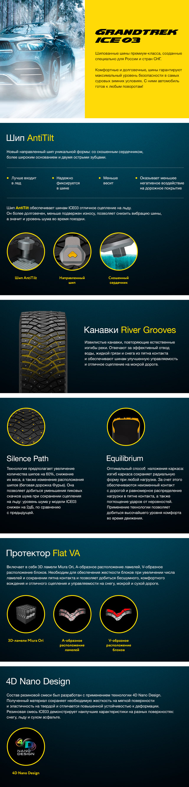 Сцепные свойства шин Grandtrek Ice03 на льду были улучшены за счёт использования новых направленных шипов противоскольжения Anti-Tilt, которые благодаря двум острым зубцам и скошенному сердечнику легче входят в контакт со льдом. Производитель (компания Sumitomo) утверждает, что они менее подвержены вырыванию, а на дорожное покрытие оказывают минимальное негативное воздействие.